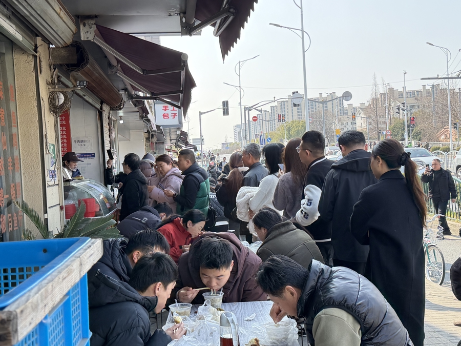 复工首日,排队顾客的尾巴一度甩到十几米之外。一周下来,食客仍在源源不断而来,老板笑称自己的个性签名是“平淡人生”,近几日却累到“怀疑人生”。一个工作日的早晨,记者也加入了现场排队行列,感受到了美食与乡音交融的城市烟火气,也捕捉到了一些让人心头一颤的瞬间。